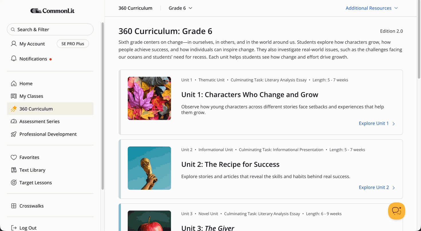 Please note: When viewing the Grade Level page for 9th or 10th grade, you will also see the option to toggle between Edition 1.0 or the newly released Edition 2.0. CommonLit will remember the 360 edition you’re using, so you don’t have to switch back and forth.