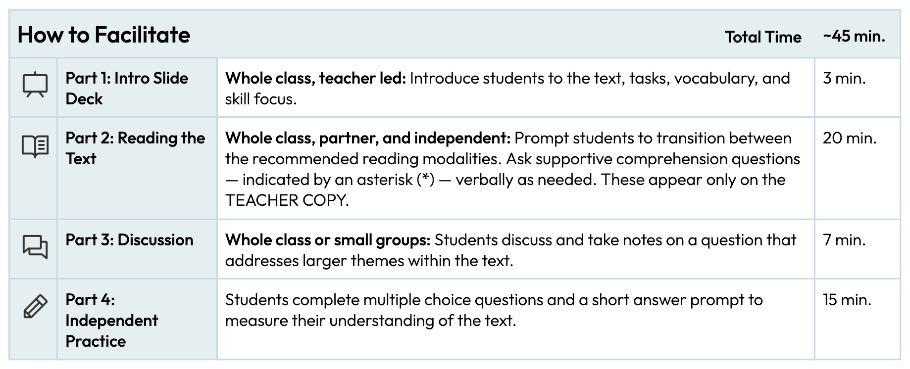 The pacing guidance is based on 45-minute middle school periods and 90-minute high school periods. When scrolling through the pacing guide, you will be able to see how many days are allotted for a lesson. This is the CommonLit recommendation, but you should make modifications based on your classes.