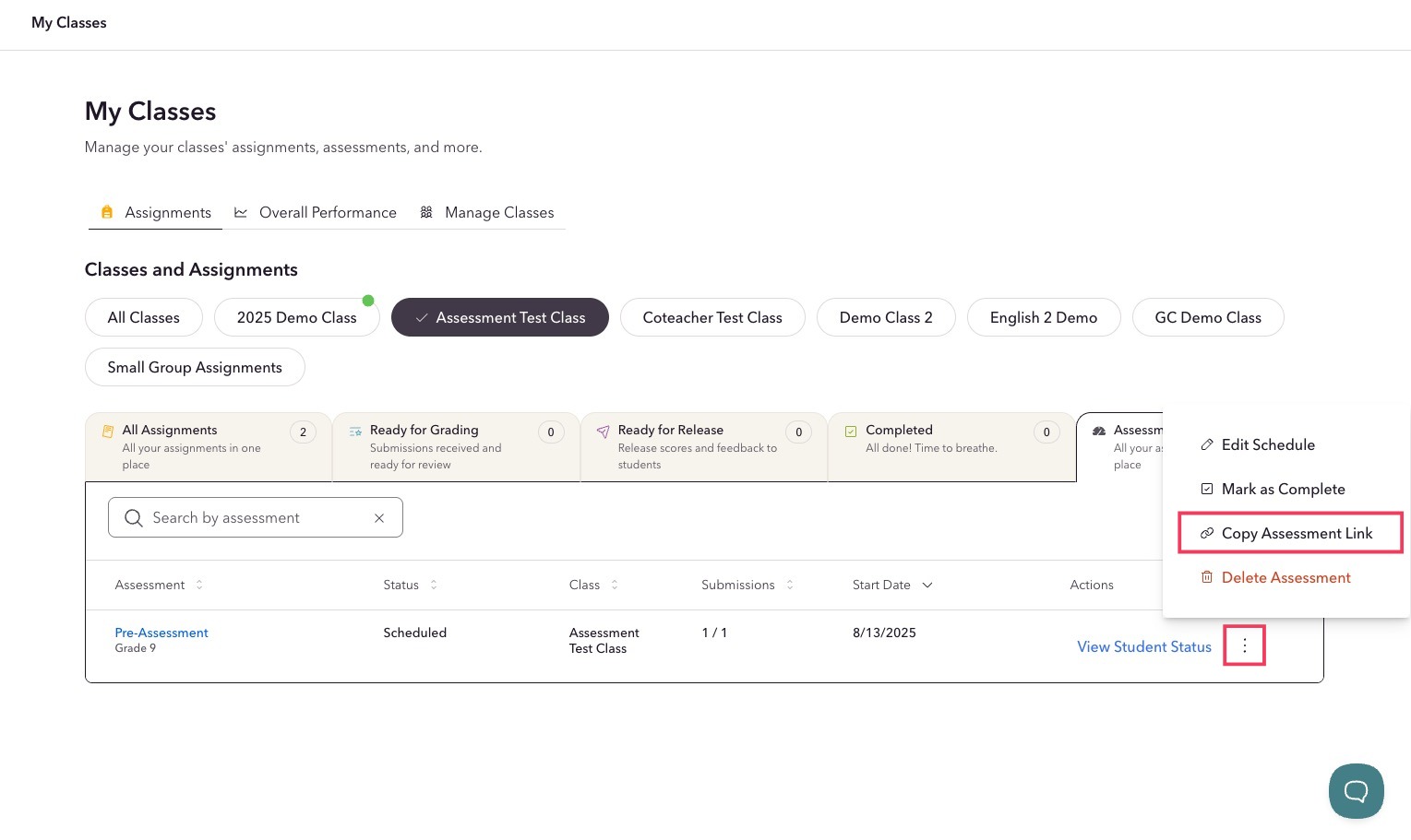 After scheduling the Assessment Series or Free Reading Assessment, a teacher should click the three stacked dots to the right of the Assessment Series (Pre-Assessment, Mid-Year Assessment, or Post-Assessment) or Free Reading Assessment on the Assessments tab of the Assignments page. Once teachers click the three stacked dots, they should see an option to Copy Assessment Link. Teachers should click that option, and then paste the link into a manually created Google Classroom assignment.